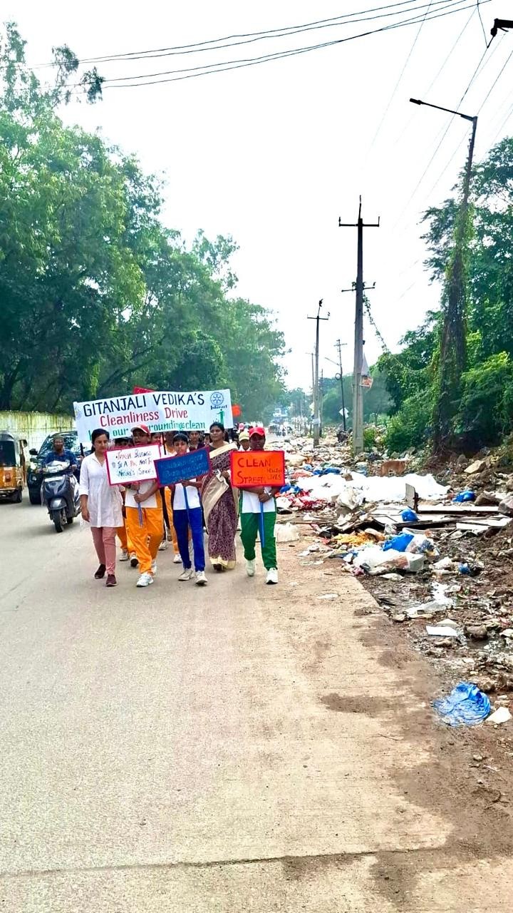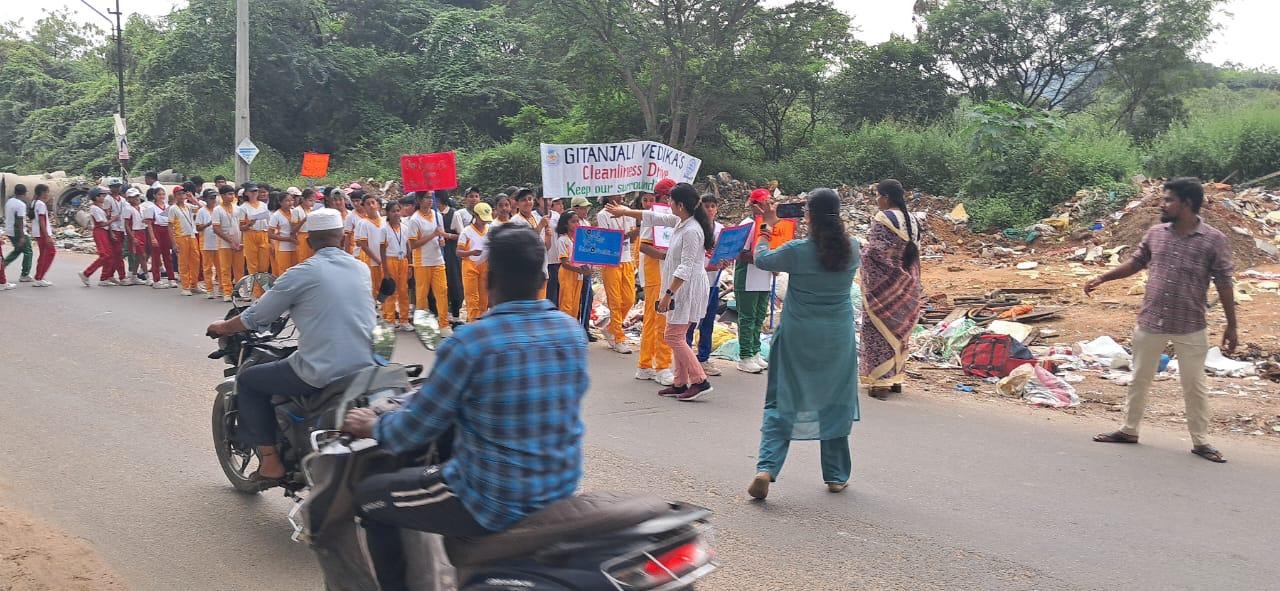 The enthusiastic students of Gitanjali Vedika School participated with great zeal, carrying thought-provoking placards and banners with powerful messages on cleanliness, hygiene, and environmental care. They also chanted slogans that echoed the vision of a cleaner and greener India, inspiring onlookers to contribute actively to this noble cause.